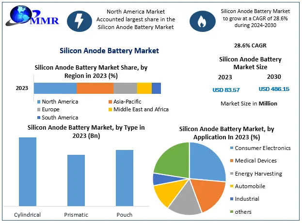 The global Silicon Anode Battery Market is emerging as a transformative segment within the advanced energy storage ecosystem. Valued at US$ 83.57 million in 2023, the market is witnessing rapid momentum driven by technological breakthroughs and increasing demand for high-energy-density batteries. With a strong compound annual growth rate (CAGR) of 28.6% from 2024 to 2030, the market is projected to reach nearly US$ 486.15 million by 2030, reflecting widespread commercial and industrial adoption.