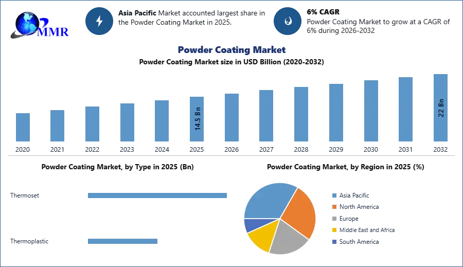 The Powder Coating Market size was valued at USD 14.5 Billion in 2025 and the total Powder Coating revenue is expected to grow at a CAGR of 6% from 2025 to 2032, reaching nearly USD 22 Billion.
